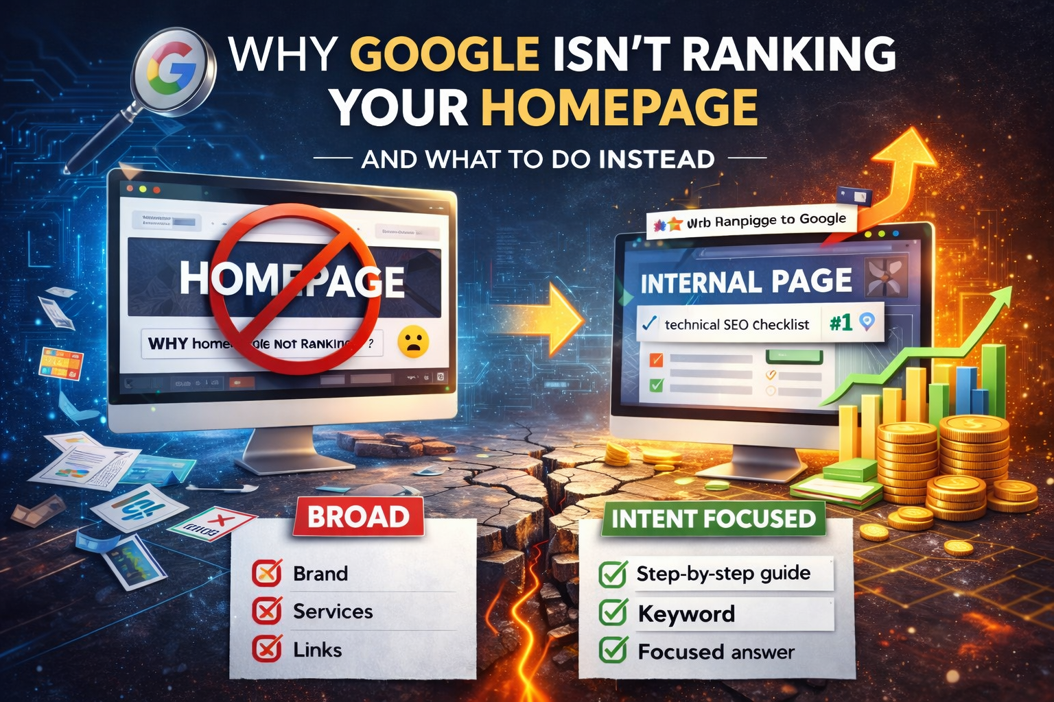 commercial vs informational intent SEO, Google ranking homepage issues, homepage keyword targeting, homepage not ranking on Google, homepage optimisation guide, homepage ranking problems, homepage SEO strategy, homepage vs landing page SEO, how to rank homepage, improve homepage visibility, intent based SEO strategy, internal linking strategy, internal page SEO strategy, rank homepage on Google, search intent homepage, SEO site structure best practices, should homepage target keywords, site structure for SEO, website architecture SEO, why homepage not ranking