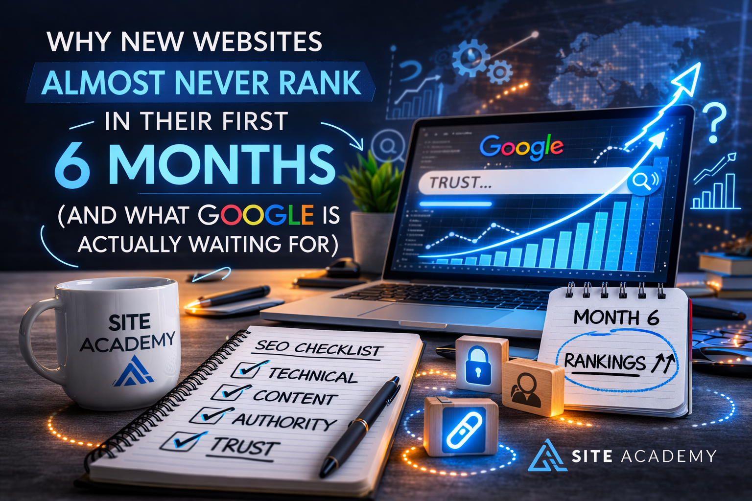 early SEO growth strategy, Google indexing new sites, Google ranking delay, google trust signals, how long SEO takes, improve website rankings, new site SEO timeline, new website SEO, SEO audit tools, seo checker, SEO for new websites, SEO optimisation for beginners, SEO sandbox period, seo trust factors, Site Academy, technical seo audit, website authority building, website not ranking on Google, website ranking factors 2026, why new websites don’t rank